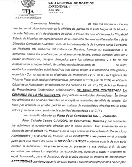 Te presentamos un acuerdo del Tribunal Federal de Justicia Administrativa que provee sobre la admisión a la contestación a la demanda de nulidad de actos fiscales y sobre la admisión de la prueba pericial contable.